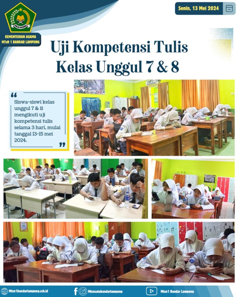 Bandar Lampung, MTsN 1 (Humas) – MTsN 1 Bandar Lampung mengadakan Uji Kompetensi (UK) Tulis kelas unggul untuk tingkat kelas 7 dan kelas 8. UK Tulis berlangsung selama tiga hari, dari tanggal 13 s.d. tanggal 15 Mei 2024. UK Tulis dimulai pukul 13.00 WIB s.d. pukul 15.15 WIB.