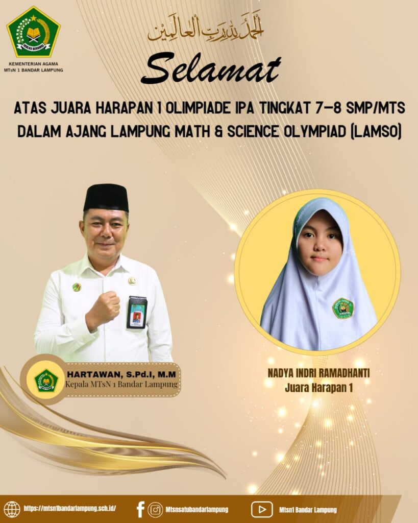 Bandar Lampung,MTsN 1 (Humas)- MTsN 1 Bandar Lampung kembali mengukir prestasi membanggakan melalui Nadya Indri Ramadhanti yang meraih Juara Harapan 1 dalam Olimpiade IPA tingkat 7-8 SMP/MTs pada ajang Lampung Math & Science Olympiad (LAMSO). Prestasi ini menjadi bukti nyata kemampuan akademik siswa-siswi madrasah dalam bersaing di tingkat provinsi.