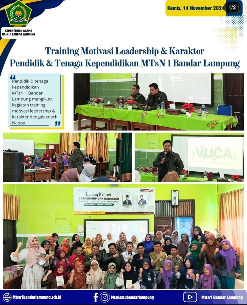 Bandar Lampung, MTsN 1 (Humas) – MTs Negeri 1 Bandar Lampung menggelar acara pelatihan bertajuk “Training Motivasi Leadership dan Karakter” yang diperuntukkan bagi guru dan tenaga kependidikan. Kegiatan ini berlangsung pada Kamis, 14 November 2024, pukul 13.00 WIB di Ruang rapat MTsN 1 Bandar Lampung, dengan tujuan untuk meningkatkan kemampuan kepemimpinan serta karakter para peserta.