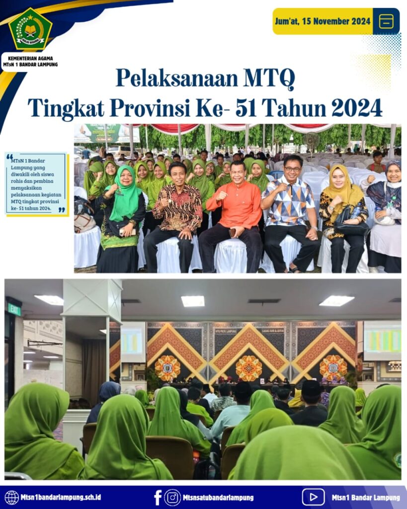 Bandar Lampung, MTsN 1 (Humas) – MTsN 1 Bandar Lampung turut berpartisipasi dalam kegiatan Musabaqah Tilawatil Qur’an (MTQ) Tingkat Provinsi Lampung ke-51 yang dilaksanakan mulai 13 hingga 17 November 2024. Kehadiran para siswa dan pembina dari madrasah ini dalam acara tersebut bertujuan untuk menyaksikan secara langsung pelaksanaan kompetisi tahunan ini dan mendukung para peserta yang berlomba dalam seni membaca Al-Qur’an. Partisipasi MTsN 1 Bandar Lampung menunjukkan komitmen madrasah dalam mendorong siswa untuk mendalami dan mencintai Al-Qur’an.
