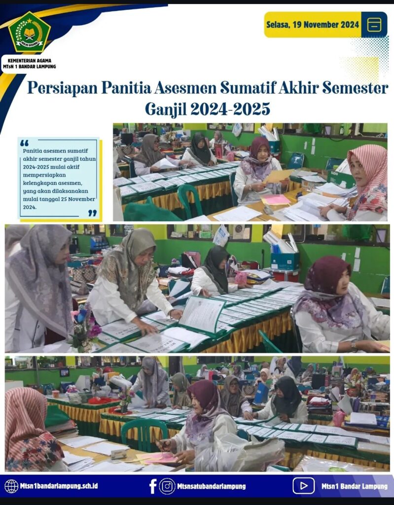 Bandar Lampung, MTsN 1 (Humas) —Panitia Asesmen Sumatif Akhir Semester Ganjil Tahun Pelajaran 2024-2025 di MTsN 1 Bandar Lampung mulai aktif mempersiapkan kelengkapan ujian sejak awal pekan ini. Ketua Panitia Ujian, Ibu Apriyani, bersama Sekretaris Ujian, Ibu Rosida, memimpin kegiatan persiapan yang melibatkan seluruh anggota panitia. Ujian kali ini akan dilaksanakan secara CBT (Computer Based Test) online dengan menggunakan handphone peserta didik, menjadikan ini langkah maju dalam digitalisasi sistem asesmen.