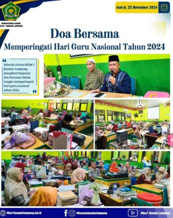 Bandar Lampung, MTsN 1 (Humas) – Seluruh civitas akademika MTsN 1 Bandar Lampung melaksanakan kegiatan doa bersama dalam rangka memperingati Hari Guru Nasional Tahun 2024 pada Jumat, 22 November 2024. Acara ini berlangsung dengan khidmat di ruang guru MTsN 1 Baca Selengkapnya